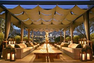A slide-wire canopy system can make a space really elegant. Our custom experts can create a system to be installed on an already existing structure or we can design and manufacture an aluminum frame structure for you. These canopies are long panels that are arranged in overhead swales that will give you a nice shady spot or can be retracted when you want a little more light. With the swales overhead, a couple of things that you can add to the structure that will take the elegant factor over the top are some soft fabric draped down on the corners and tied back like curtains and then some twinkle lights woven around the swales. Since both our acrylic and mesh fabrics that are used to make the canopies come in a variety of colors, you can either match your curtain fabric to the canopy or find a complementary color.