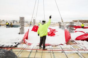 Snow Shields remove hundreds of square feet of snow in minutes. Just lay the Snow Shield out before a storm, attach the corners to overhead cranes after the snow has fallen, and lift. If you are using Snow Shields at home, you can easily attach them to a four-wheeler, UTV, etc. to pull the tarp off your driveway. It will make snow removal easier on your back and you’ll have more time to spend with the out of town relatives. Yes, that’s a good thing 😉