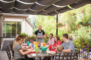 One of the best things about SugarHouse is we offer several awnings that can be retracted or temporary. Our Shadeglide Slide-wire Canopies and Rayblock Shade Sails are two great options. Shadeglide Slide-Wire Canopies have fabric panels that slide back and forth on a thin metal cable to provide shade as needed. And if dad wasn’t born with the height of a basketball player, a pull stick is included to help him reach the overhead panels.